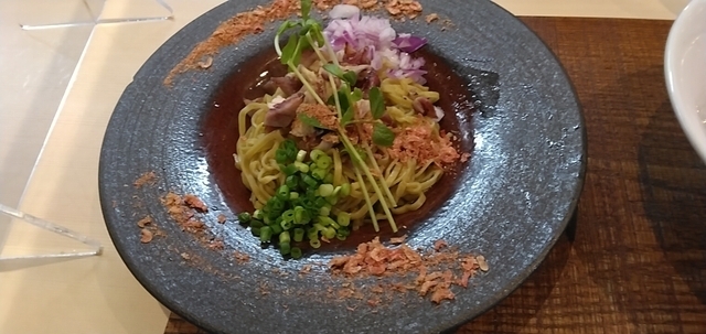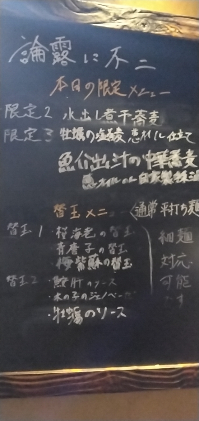 2022.10.8(土)12:45訪問。 満席、店内待ち二組、後客多数。 予想していたより混んでおらず、すんなりと入店。 食券機で限定二(水出し煮干蕎麦)をオーダー。 5分ほど待ち席に通され、その後2~3分後、着丼。 まずはスープ。 煮干しが強く感じられ、あっさりしていて旨い。 麺は中細ストレート。 具は、香ばしいチャーシュー、刻みネギと刻みタマネギ。 ごちそうさまでした。
