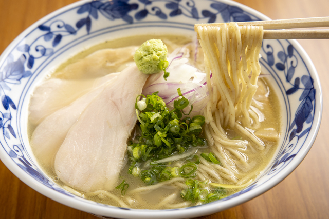 わさび風味の鶏白湯は大山鶏のスープをさらに炊き詰めて仕上げたあっさり白湯!低加水麺と合わせて!