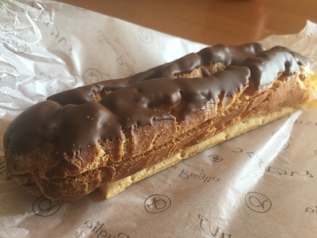 ガトープーリアといえば、ズコットとエクレア! どちらも大人気商品で、毎日行列に並んで整理券をゲットしなければ買えないほど。 エクレアはかなり大ぶりなのに、ひとつ108円という大サービス商品。 シュー生地とパイ生地のコラボに、たっぷりのカスタードクリームが入っていて、間違いなく美味しいです。 月替わりのエクレアもあり、毎月のお楽しみです。
