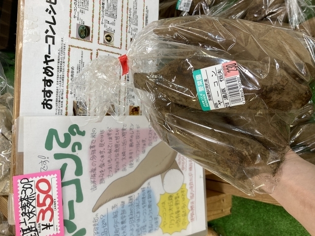 茨城県名産のヤーコン発見!甘味があって食感は梨のようで美味しい!レシピまでもらいました!他の野菜も大ぶりで安い!