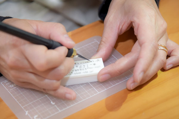 細かい文字や住所のはんこもオーダーいただけます。ひとつひとつ心を込めて手で彫っています。