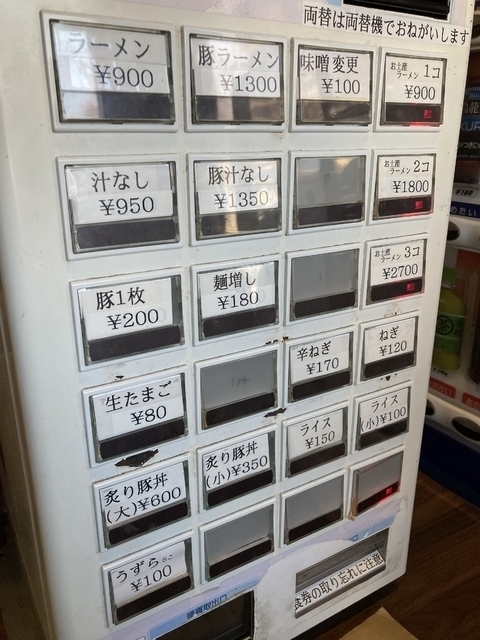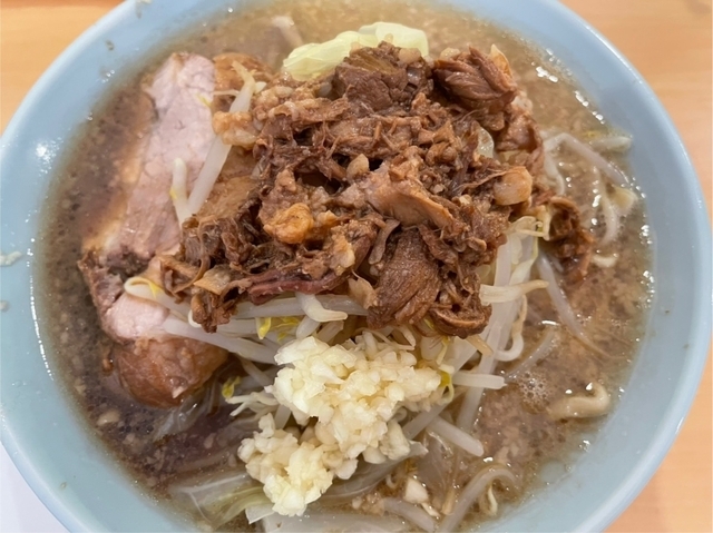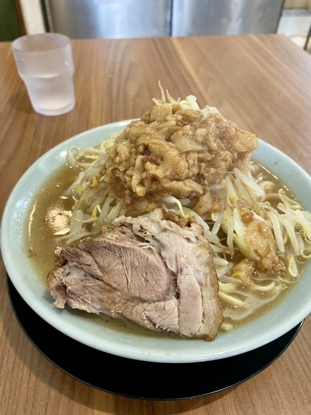 平日昼に初訪問。世情により値上げしたばかりの模様です。基本のラーメンの食券を券売機で購入し、ニンニク入りで注文しました(ニンニク・野菜・アブラ増量無料ですが、みな普通に)。卓子席のみで、ほぼ満席の盛況。各々にプラ板を立てて対策しています。コップ水・塗り箸・レンゲは冷水機脇に置いてあり、セルフで取りに行く形です。10分程で丼到来。載っている豚バラ叉焼の厚さ(1cm超)とサイズ・量(3枚)にやや圧倒されます。野菜(茹でもやし・茹でキャベツ)の小山の上には、豚カスの入ったアブラに辛味の利いたおろしニンニクが添えられています。醤油ベースのスープは背脂が浮き、やや塩辛い味付けで、極太麺(300gほど)が浸っています。がっつり系なので、並盛ながら満腹となりました。