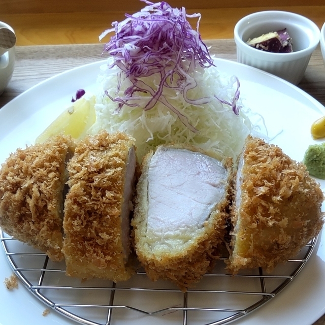 ◆厚切りロースカツ とにかく分厚いがお肉じたいは やわらかくて食べやすい。 ソース、カラシ、わさびを 使って味変しながら、 美味しくいただきました。