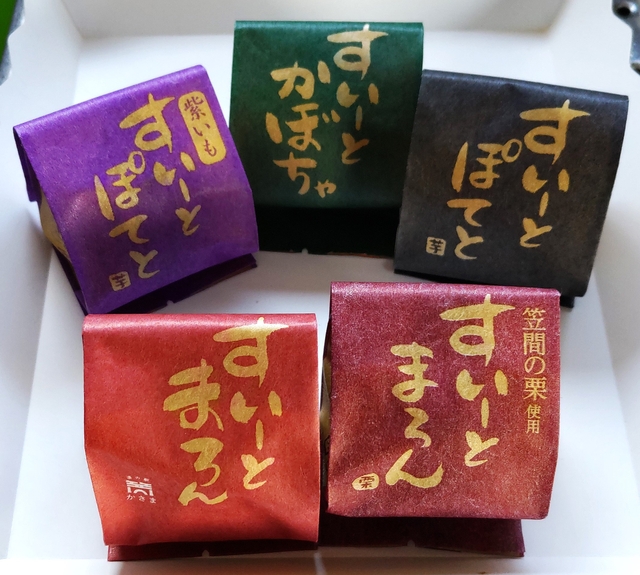【笠間すいーとまろん】 道の駅かさまにある農産物直売所「みどりの風」の店内で、お菓子を購入しました。 笠間の栗を使った笠間すいーとまろんプレミアムです。 お菓子の約80%に栗を使っていて1つ260円。普通のすいーとまろんは190円。 そのほかに、すいーとぽてと(120円)、すいーとぽてと紫いも(140円)、すいーとぽてと抹茶、 すいーとかぼちゃ(140円)がありました。箱売りもありますが、バラでも購入できます。 お土産におすすめです。