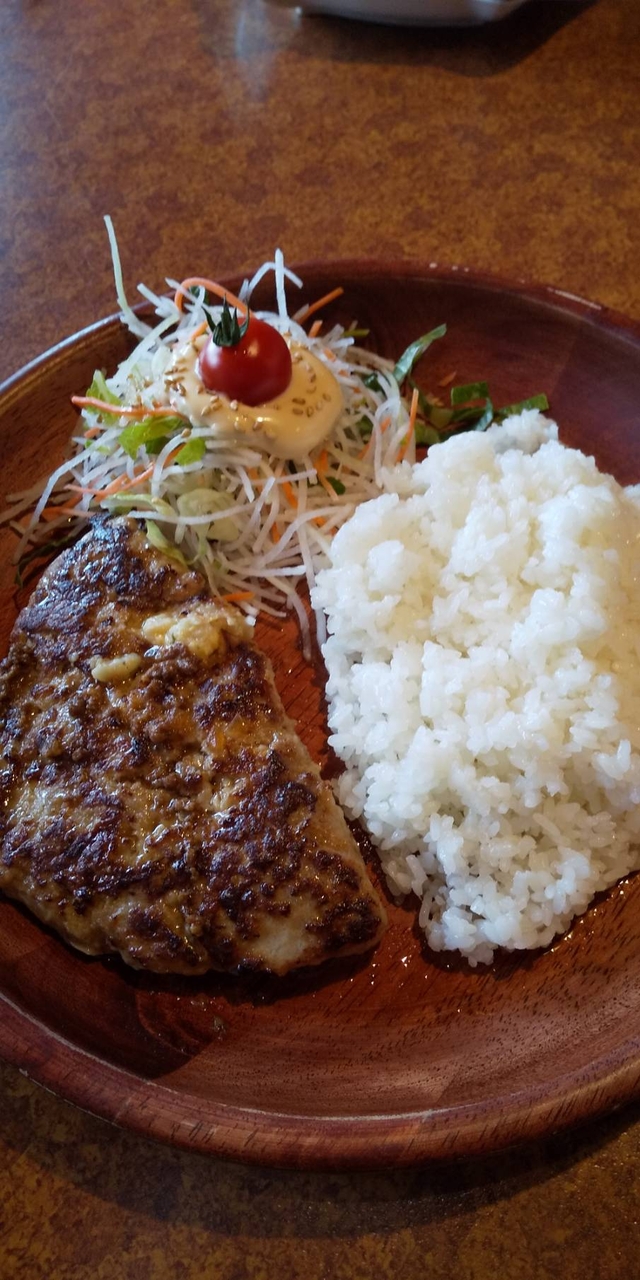 平日やや遅い昼にて利用しました。ただこちらは早くも年末年始日程で、ランチメニューは休止中とか(ランチドリンクメニューも休止中)。グランドメニューのフォンデュ風チーズバーグディッシュをハンバーグ150gで、加えてみそ汁と追加ディッシュサラダを注文しました。メインは木製の浅皿に盛られているのが特徴的で、並盛ライスにハンバーグが添えられ、白いとろけるチーズがハンバーグを覆うようにかけられています。チーズは特製ブレンドだとか。またチーズの表面には甘く味付けされた豚挽肉と飴色の刻みタマネギが散らされています。傍らにはサラダの小山が2つ。千切りダイコン・ニンジン・レタスの小山の上に胡麻を散らせた特製マヨネーズがかけられ、プチトマトがトッピングされています。みそ汁は大きめのお椀で、日替わり(?)の具は岩海苔・刻み青ネギ・巻き麩。和洋折衷の内容ですが、普通に美味しくいただけました。