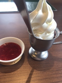 北海道ソフトクリーム。いちごソースといただきます。まずはそのまま。ミルク感が濃厚でそのままでも十分美味しいです。いちごソースは、甘酸っぱくて粒感があり、合わせて食べると美味しいです。