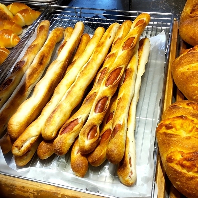 人気のロングソーセージフランスとゲランドの塩パンを購入しました。 ロングソーセージは、ソーセージをバゲット生地で包んでカリッと焼き上げているので、結構噛みごたえのあるパンです。購入時に好みの大きさにカットしてくれます。(300円) 塩パンは、バター風味はあまり強く無く、表面に塩を付けて焼き上げているので、塩味を感じることができるパンです。(80円)