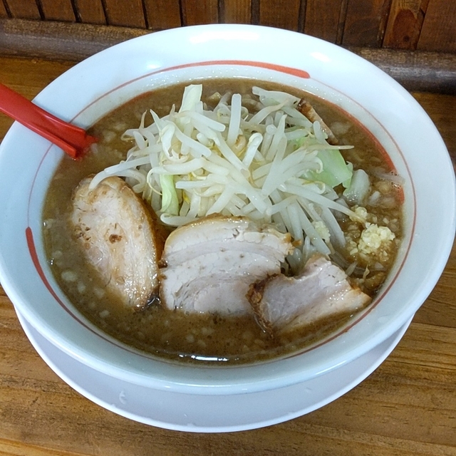 ●ラーメン980円 麺量、野菜、背脂、ニンニクを 用紙に記入して渡します。 お馴染みのビジュアル。 麺は太麺のもちもち。 スープは濃厚だかまろやか。 ぶ厚いチャーシューを 混ぜながらいただきます。