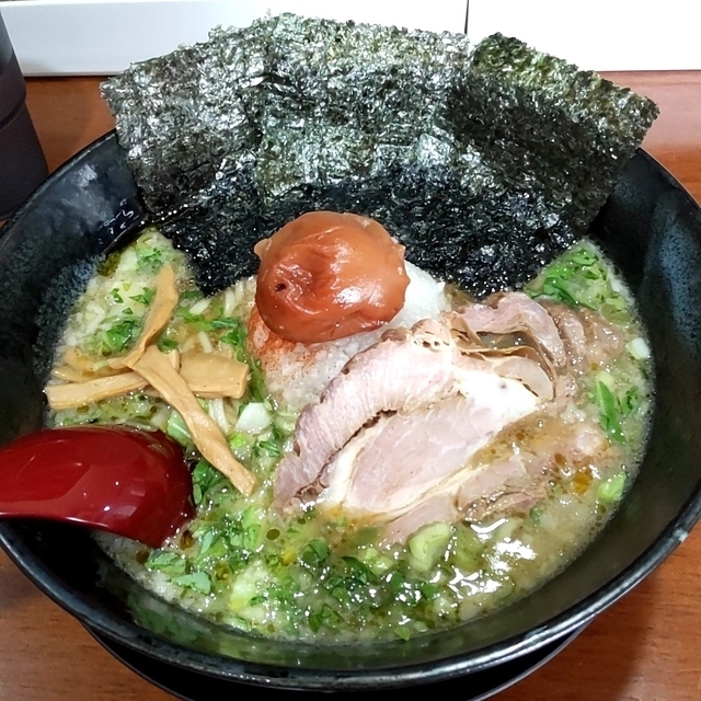 ●みぞれラーメン800円 大きな梅干しと大根おろしがのった さっぱりとしたラーメン。 スープはベース豚骨の濃いめ。 麺は中太麺のやわらかめ。 トッピングには、 チャーシュー、ネギなども。