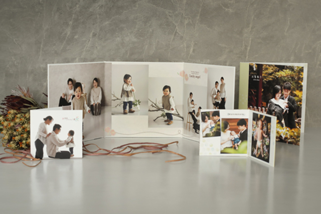 ・2面タイプ 22,000円(税込) ・3面タイプ 30,800円(税込) そのまま飾れる見開きタイプで5カット・8カットまで選べます