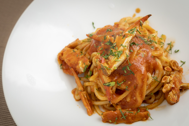 イタリアンのパスタソースにラーメンを絡めた和え玉も必食!ワタリガニトマトソースは600円