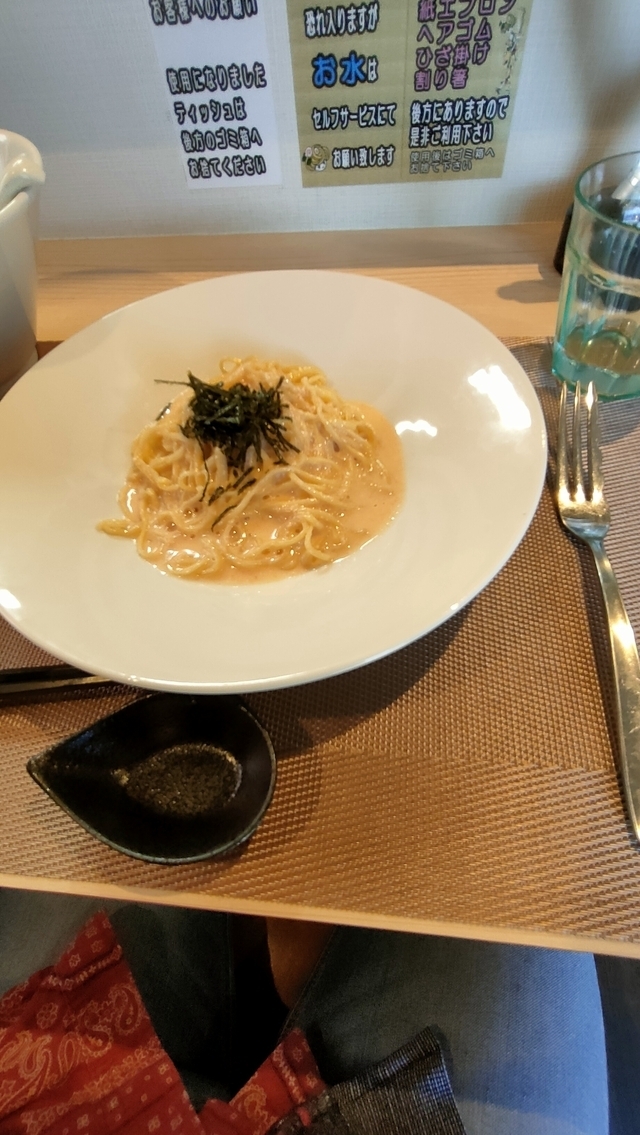 初来店、鶏と煮干しの醤油味をチョイス!プラス和え玉で、たらこクリームをチョイス。 和え玉はパスタ感覚でいただきました。