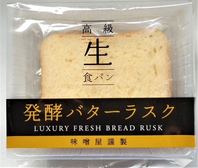 【高級生食パン発酵バターラスク】 内山味噌の酵母や純生クリーム、バターを使って焼き上げた食パンをラスクにした商品。 9~10cm四方の大きさで、厚さは約1cm。そのラスクが3枚入っています。 バターの風味がよく、とてもおいしかったです。 今回はたまたま常陸太田市内のスーパーで見かけたので購入してみました。(400円)