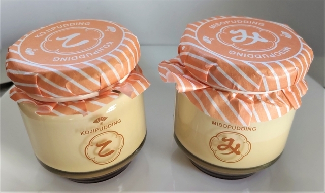 《みそプリン&こうじプリン》 味噌や甘酒を加えて造ったプリンです。1つ350円。 味噌や甘酒が使われているプリンとは気づかないくらい、濃厚な甘さのおいしいプリンです。