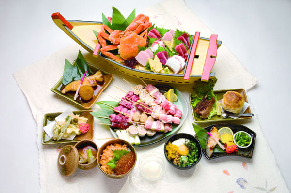 宴会コース5250円は、舟盛の刺身、備長炭串焼き、焼物、揚物、煮物などボリューム満点の10品目。