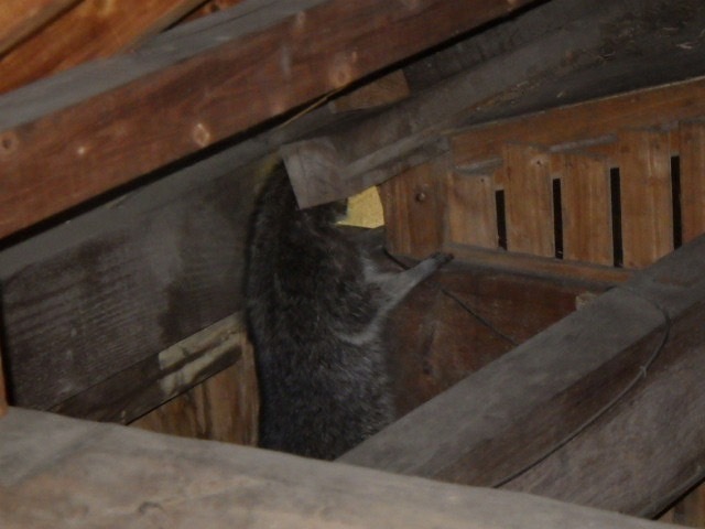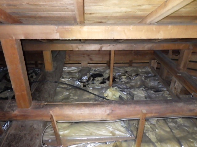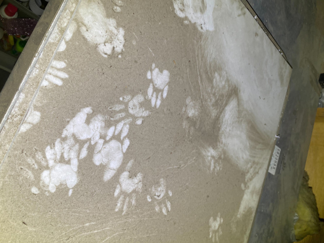 天井裏に残されたアライグマの足跡。駆除後は悪臭や家屋の腐敗を防ぐため糞尿などの清掃・消毒を行います