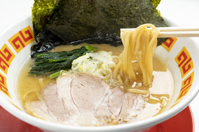 全系の名にふさわしい横浜家系醤油ラーメン!角ひねり麺を使用。骨粉が残る濃厚なスープは一食の価値あり!