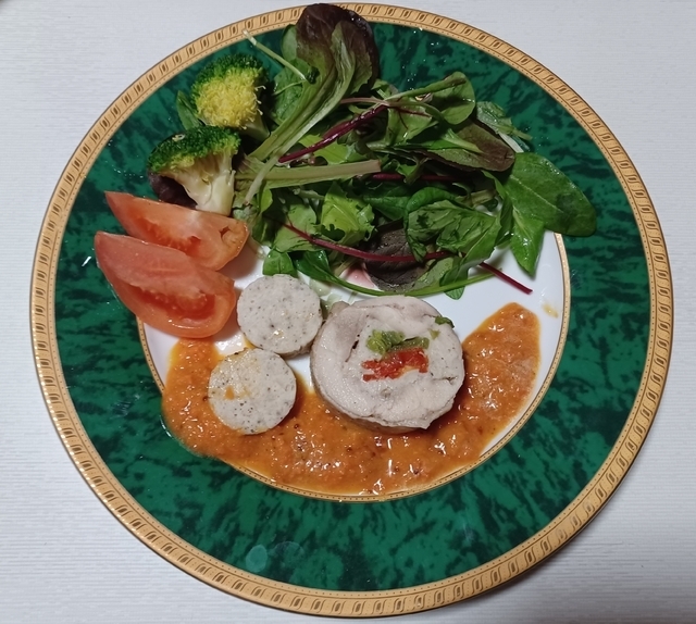 クリスマスメニューの中から「鶏肉のバロティーヌ」をチョイスして作ってみました。黒オリーブがなかったので、スナップえんどうを代わりに使いました。美味しくてオシャレなプレートで家族に大好評でした。 今回、レッスンの動画を撮っていたので、手順を確認しながら復習できました。