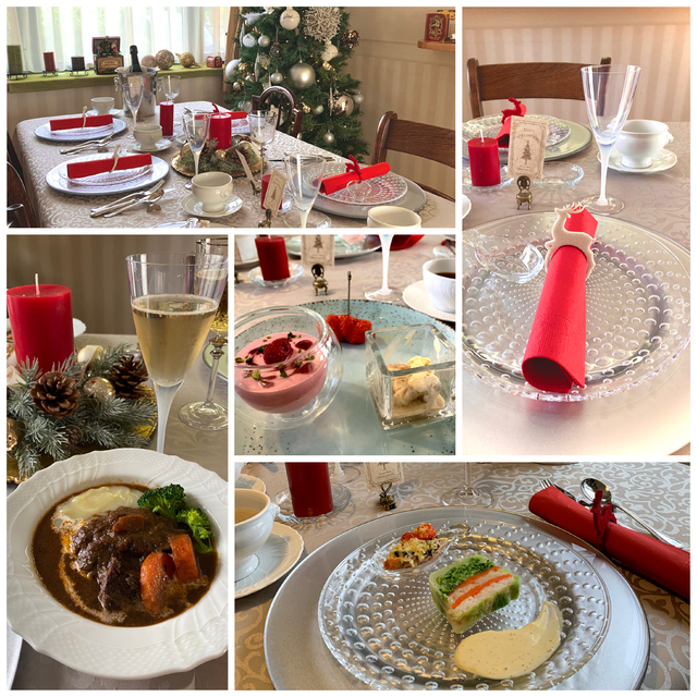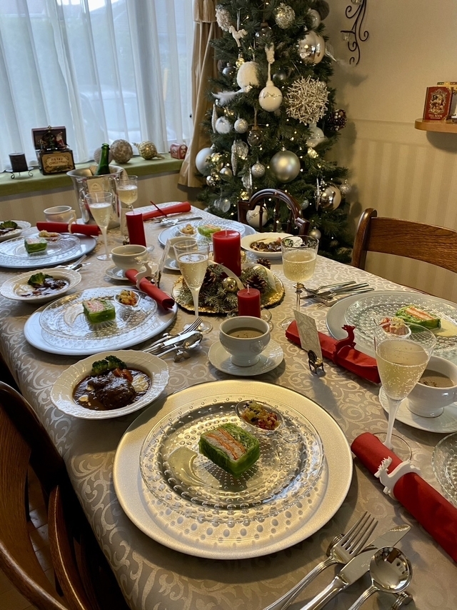 ステキなクリスマス料理のレッスン 常陸牛を使ったビーフシチューは、フランベも仕方も習いますし、野菜と蟹のテリーヌは断面も綺麗、3種のきのこのポータージュ、サーモンとミニトマトのオーブン焼き、フランボワーズのムース どれも まるで、レストランでいただくような出来栄え テーブルコーディネートも素敵で、楽しく幸せな時間です