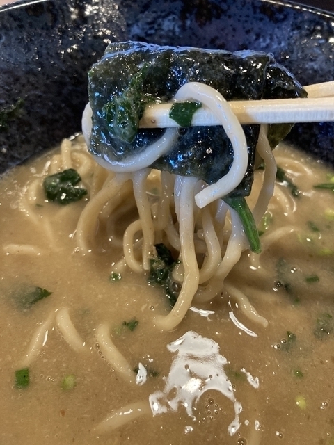 平日昼に再訪すると、駐車場はやはりほぼ満車と盛況です。今回は限定メニューとして「煮干豚骨」が出ていたので、これを麺硬めで、またクーポンの味玉を注文しました。カウンター席も卓子席もほぼ埋まっており、カウンターの空き1席に漸く着きました。到来した丼には、茶褐色のドロッとした醤油ベースの煮干豚骨スープが張られ、細麺が浸っています。節系の香りが強い。具は5~6mm厚の炙り豚バラ叉焼2枚、板海苔1枚、太メンマに刻み万能ネギ。追加の味玉は半熟ゼリー状の黄身でした。煮干豚骨の味わいも美味しく、今回も完食でした。