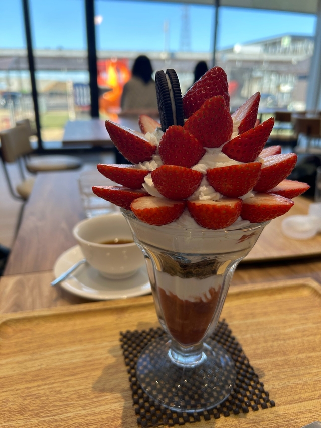 イチゴ狩りの時間を過ぎてから、 大地さんへ着いて、いちごパフェとコーヒーをゆっくり味わいながらいただきました。 いちごが甘くて最高です。
