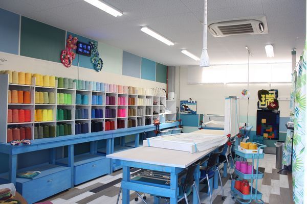 多数の糸が並ぶ店内に気分が上がる! 様々なデザインができるので自分好みのラグマットが作成可能です