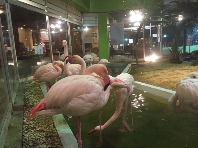 日曜日のお昼に行きましたが、家族連れで賑わっていてほぼ満席でした。昔から変わらず人気のお店です。フラミンゴのいるプールをコの字に囲んだ客席のどこからでも鳥たちを眺められます。面白いコンセプトのレストランですので、皆さんも是非行ってみてください。