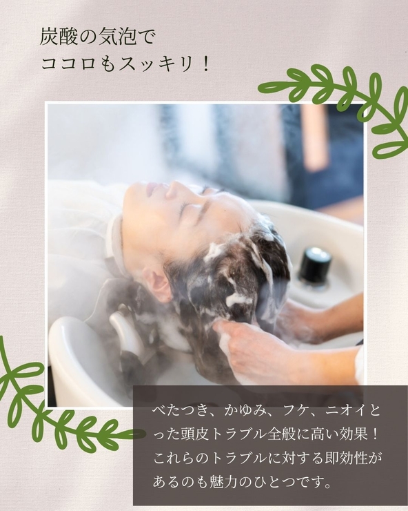 ◆炭酸によって頭皮を洗浄 炭酸泉の細かな気泡が毛穴に詰まった皮脂汚れを洗い流します。 血流が悪くなってターンオーバーが乱れている地肌は皮脂が過剰に分泌され、フケやかゆみが発生しやすい状態。 炭酸には、こういった頭皮環境を整える効果があります。 ◆ハリ、コシのある髪に 頭皮環境が整うと、頭皮から毛髪に多くの栄養が送られるので、弱った髪が強くなり、ハリやコシの向上が期待できます。 ◆眼精疲労や肩こりにも◎ 長時間同じ体勢だったり、パソコン作業をする機会が多かったりすると血行不良に陥りやすくなります。 目の疲れや肩こりが原因なら、炭酸ヘッドスパで解消できる可能性があります。