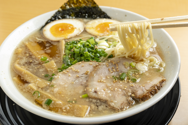 高萩に誕生したガッツリ系の濃厚ラーメンがいま話題。スープには豚のゲンコツを中心に丸鶏や背脂を加え、チャーシューに使うバラ肉からも出汁をとっているのが特徴。タレも突出したものは使わず全体をまとめる役割に徹しています。そこに店でとった背脂をたっぷり。麺は店主こだわりの製麺所から取り寄せたモチモチの滑らかなもの。J系にしては意外な組み合わせですが、バランスのとれたこのラーメンに見事にはまります。食べやすいにも関わらず満足感は損なわないのが人気の理由です。もちろんコールもOK!ニンニク、野菜、脂、カラメにも対応してくれます。チャーシューを煮た醤油ダレで味を好みに調整しながら食べられるのもポイントです。
