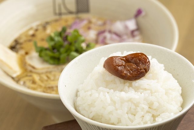 ダイブ飯(梅)200円。梅の酸味は鶏白湯スープとの相性◎!他にもキムチ、白飯からチョイス可。
