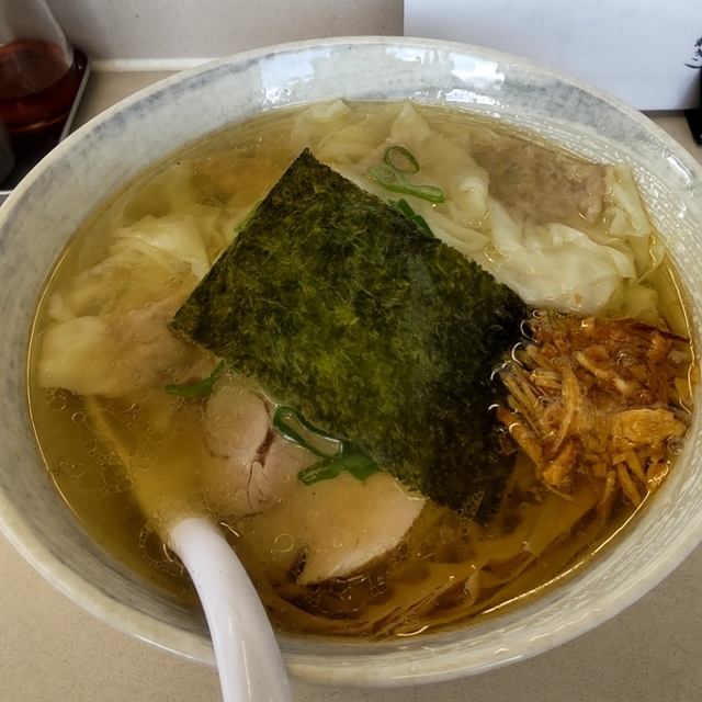 ●ワンタンメン塩 スープは澄んできれいな見た目。 昔ながらの塩スープどいった感じ。 麺は極細ちぢれ麺のややかため。 トッピングのワンタンは あっさりして美味しい。 全体的にインパクトはないが 安心してたべられる塩ラーメンでした。