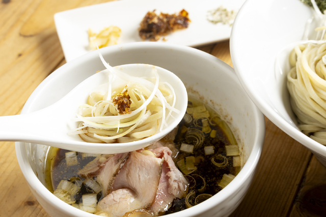 名店喜元門の新機軸になるかもしれない清湯系つけ麺が登場!!甘辛酸のクラシカルなつけ麺と思いきや、上品な旨味が磨かれたスッキリとしたつけ汁が自慢です。たっぷりのった名古屋コーチンの鶏油が熱々のスープに蓋。スッキリとしていながらも鶏油の強烈な旨味が満足感を高めます。さらに別皿のトリュフ塩、ライム塩、キャラメリゼしたおかかが多彩な味の変化を生み出します。一度では食べ尽くせない美味しさをぜひひと口体感してください。