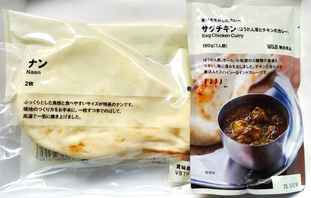 今回は、サグチキンカレーとナンを購入しました。いつもはカレーをごはんと一緒に食べていますが、ナンがあったので、一緒に購入して食べてみました。サグチキンカレーは、辛さレベル4でしたが、あまり辛くなかったです。ナンは2枚入りで、トースターで温めてから、カレーと一緒においしくいただきました。ただ、大人の男性だと、ナン2枚では物足りないので、もう1袋用意しておくといいと思います。 サグチキンカレー(490円)、ナン(190円)。