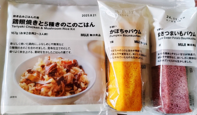 【炊き込みごはんの素】 TVで無印良品の炊き込みごはんの素についての番組を見て、食べてみたくなり訪問しました。いろいろな種類の素の中から、今回は『鶏照焼きと5種きのこのごはん』の素を購入しました。 5種類のきのこは、しめじ、舞茸、しいたけ、エリンギ、きくらげです。そのきのこの旨みと照焼きにした鶏肉の香ばしさが感じられ、おいしくいただきました。(2合用 390円) また、秋ということで、かぼちゃと紫さつまいものバウムも一緒に購入しました。バウムを含めお菓子類もいろいろあるので、選ぶのが楽しいですね。(1本180円)
