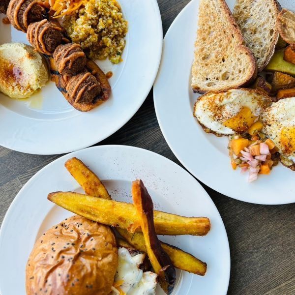 ヴィーガンプレート、ファームハウスブレックファースト、グリルチキンバーガー