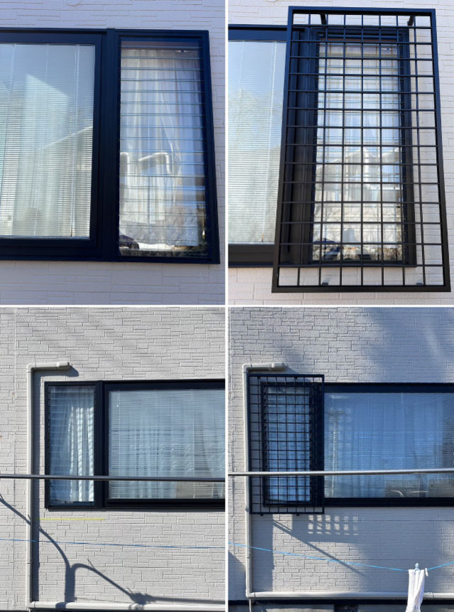 外側に開くタイプの窓は外側に面格子が取付できませんが、室内側に付けることで解決できます。室内面格子は安心のCPマーク製品です。