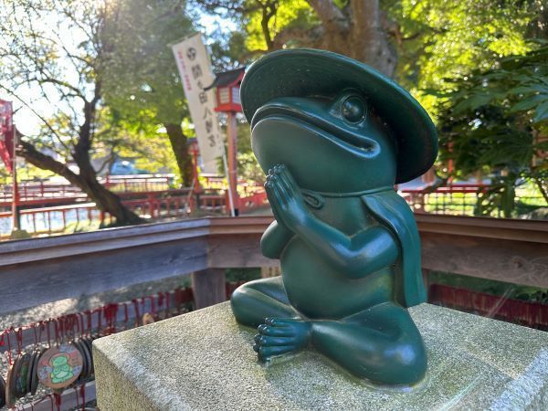 境内にある「無事かえる像」を囲むように絵馬を掛けます。祈願を込めて、かえるの像を撫でてみましょう!