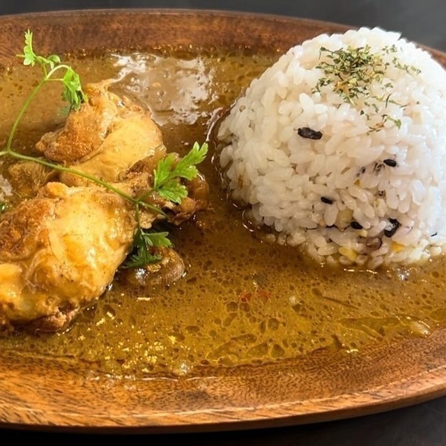 特に人気なのが、骨付きチキンカレーです。五穀米に、ホロホロに煮込まれたやわらかいチキンがたっぷり。彩り豊かな野菜もふんだんに使われており、見た目からも食欲をそそられます。セットには、サラダと、酸味を抑えて食べやすく仕上げたなめらかなヨーグルトが付いています。