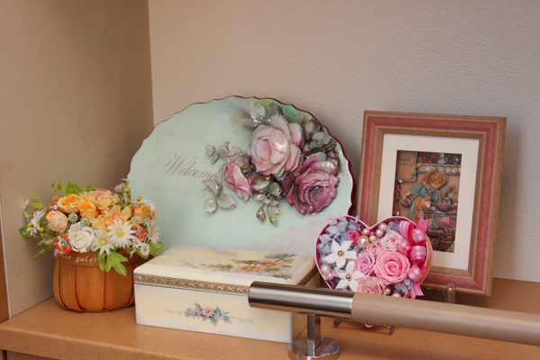 アトリエの中は、美しいバラとシャドーボックスと様々なデコパージュでいっぱい。