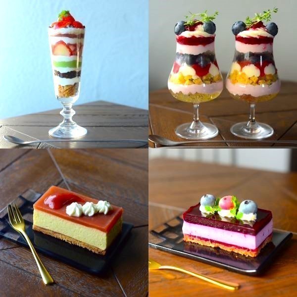 つくば市「アオニサイファーム」のブルーベリー、「ぺぺ農園」の苺、「CAHAYA FARM」のルバーブなどの果物を使い、パルフェや自家製ジャム、季節限定スイーツを丁寧に手作りしています。