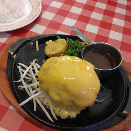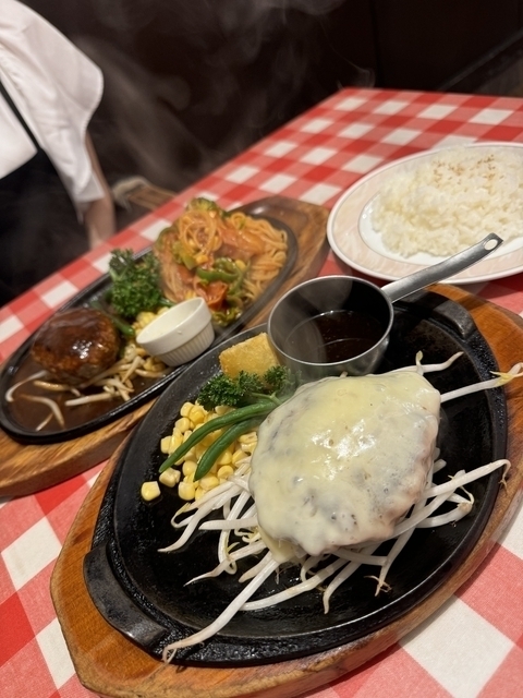 ハンバーグが肉汁たっぷりでとってもおいしかった!鉄板のまま提供されるので,最後まで熱々で食べられたのも良かったです!