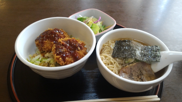 気になるメニューがあったので、再度入店。 ミニミニ定食。 ひれかつのソースカツ丼、やわらかで、美味。 つがるラーメンのスープ、つい飲み干してしまいます。