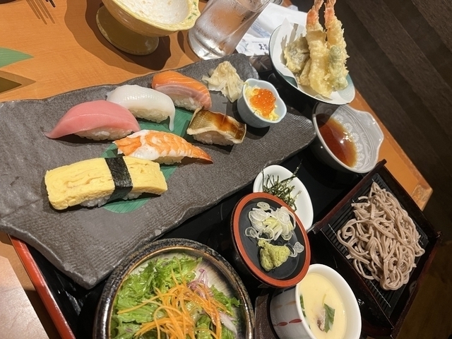 ボリューム満点な和食料理をとことん楽しめます! サクサク天ぷら、こしのある蕎麦、新鮮なお寿司どれも絶品です!