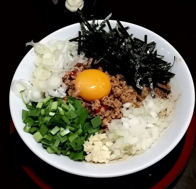 ⚫台湾まぜそば800円3.5 辛口の挽き肉、玉子、のり、ネギなど、 見た目の美しい、 美味しそうなビジュアル。 麺は太麺で、もちもち。 辛さも丁度よい。