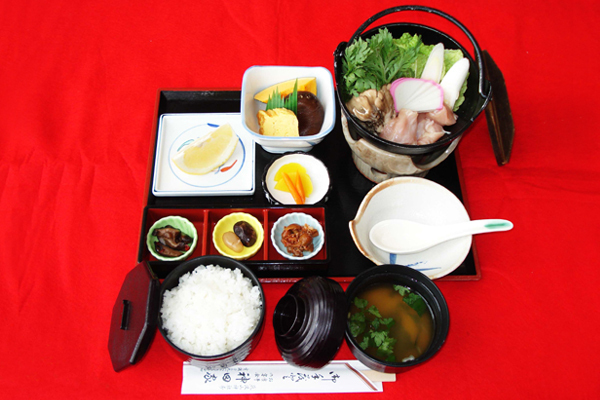 つくば茜鶏鍋定食1650円(要予約)オプションでガマの油売り口上実演可能。団体様のみ