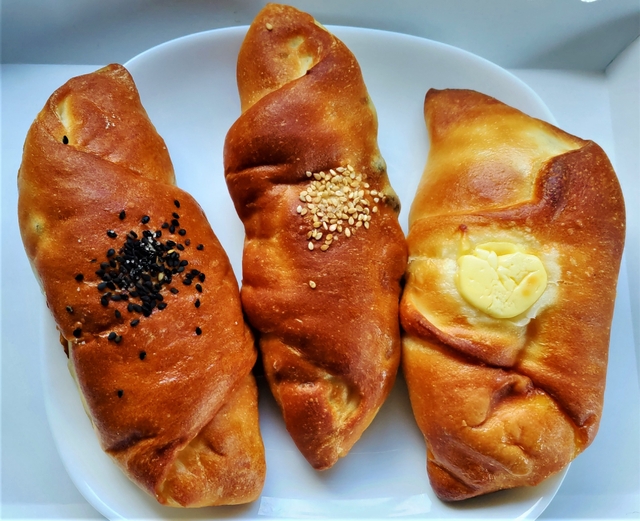 【塩パンは4種類】 一番人気の塩パンですが、その塩パンの中にチーズ、大納言小豆、さつまいもが入った商品がありました。パンの中には結構な量がそれぞれ入っていました。各商品1つ190円。 ※注意※ 人気店なので行列ができています。混んでいる時は、列になって進みながら、購入したいパンを取って行きます。二人の場合は一人が列から抜けても戻れますが、一人の場合は、一度列から抜けてしまうと戻れなくなる場合があるので、列から抜けないようにした方がいいです。