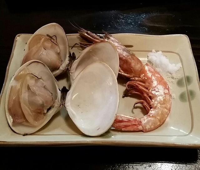 大洗町 海鮮どんぶり亭。 海鮮丼が有名です。 海沿いにあるので、雰囲気も良い。 名前を書いて、しばらく待つ。 カウンターとテーブル席があり、カウンターのほうが回転がいいかも。 そして、お目当ての ●浜焼きセット1000円 はまぐり2点・ほたて・エビが付く。 はなぐり・ほたてがぷりぷりで美味しいが、エビが少し小さめかな。