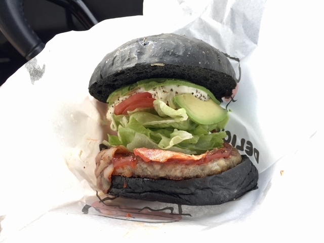 ビーチバーガー650円を食べました!ビーチバーガー は真っ黒バンズが特徴的ですが、アボカド、レタス、トマト、牛肉パティ、ベーコンがサンドされており、野菜とマヨネーズ、お肉とソースの相性も抜群で見た目に負けず味も抜群です!