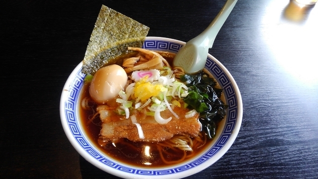 久しぶりに平日夕方に再訪し、基本のらーめんとクーポンで餃子(3粒)+追加叉焼1枚を注文しました。到来したらーめんはあっさり醤油味で、鶏・豚・魚介から取った出汁が合わせてあって美味しい。太麺使用で、麺上には約5mm厚の豚バラ叉焼(追加と合わせて2枚)、半熟味玉半個、ナルト1枚、ワカメ、メンマ、刻み柚子皮に刻みネギが載っています。美味しいけれど価格的にはやや高め。餃子はまあ普通でした。