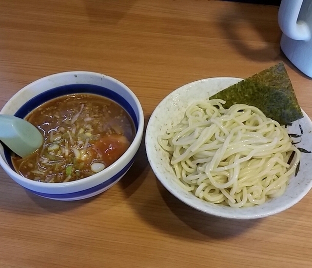 先月大晦日の昼に再訪すると満席で10分程待つ盛況さです。今回は「極細つけ麺」を並盛で、クーポンの味玉+餃子(3粒)とともに注文しました。やはり味玉(半熟半切1個分)+餃子の皿が先に到来。餃子は相変わらずやや大きめ。次いで細切海苔をトッピングした極細麺の丼とつけ汁鉢が到来しました。熱々のつけ汁は一味のピリ辛と醤油ベースの清湯で、味わうと独特の酸っぱさと甘さ、それにほんのり辛いのが特徴的です。具は約4-5mm厚の豚ロース叉焼1枚にナルト1枚、ワカメ、メンマ、ゴマに刻みネギ。追加の味玉も投入して今回も美味しく食せました。なお餃子はやはり普通の味わい。